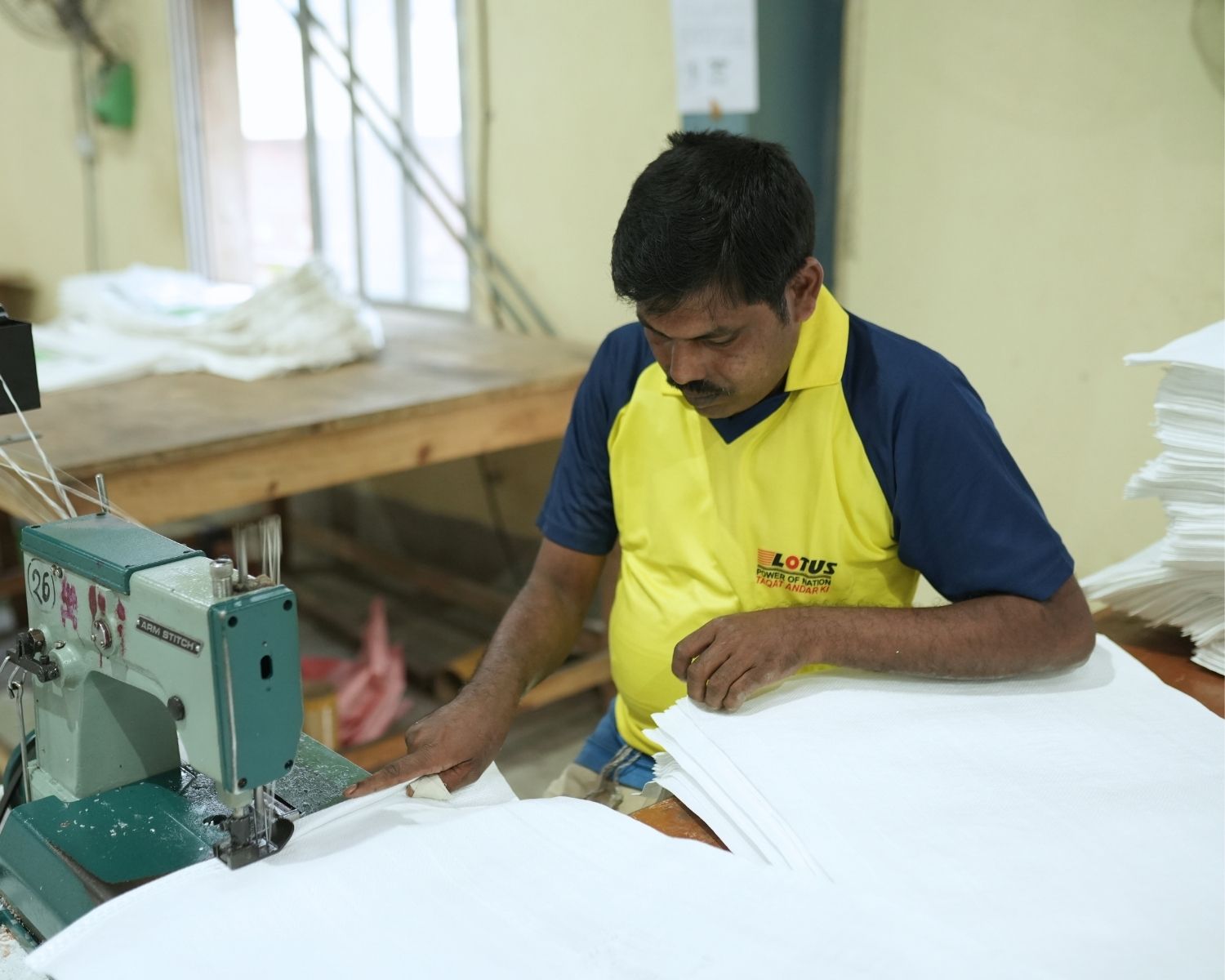 The stitching machine joins cut pieces of fabric together, forming bags, sacks, or other finished products with strong and durable seams.