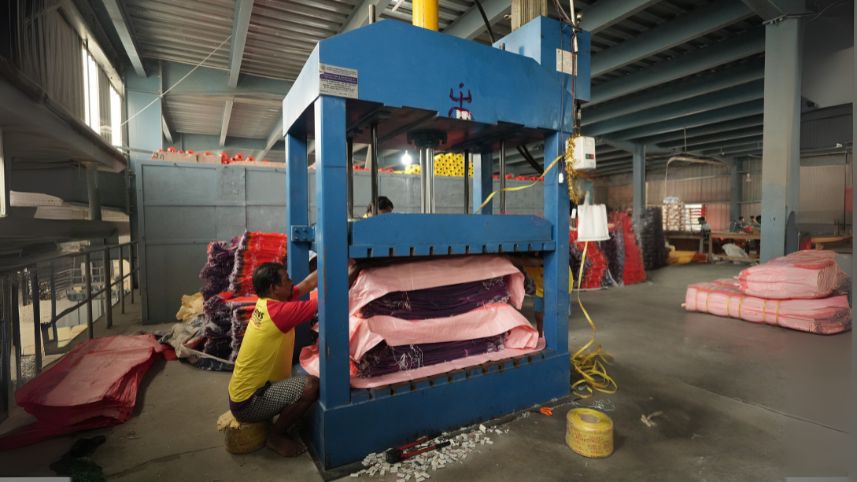 This machine compresses finished bags into compact, standardized bales, making them ready for efficient storage, export, and domestic logistics.
